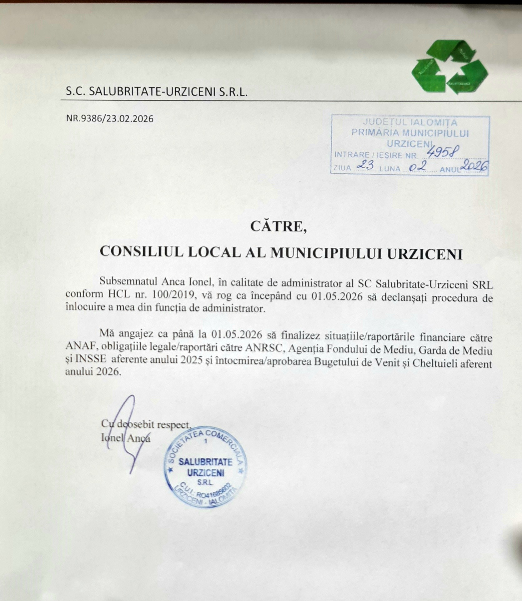Vezi Adresa nr. 9386/23.02.2026 referitoare la declansarea procedurii de inlocuire a administratorului